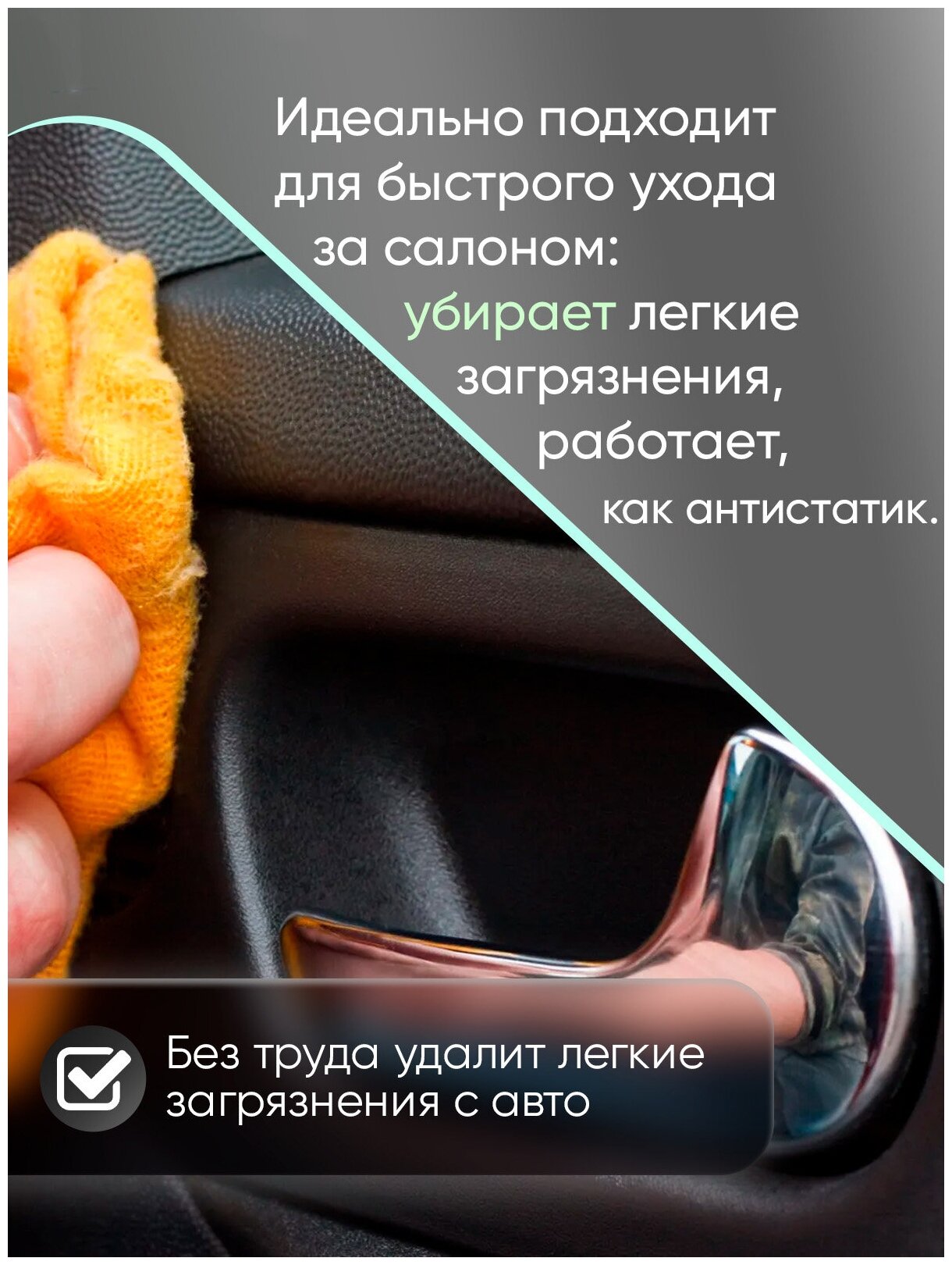 Нанесите квик детейлер на мягкую микрофибру и равномерно распределите по поверхности сидений, коврикам и другим элементам салона.
