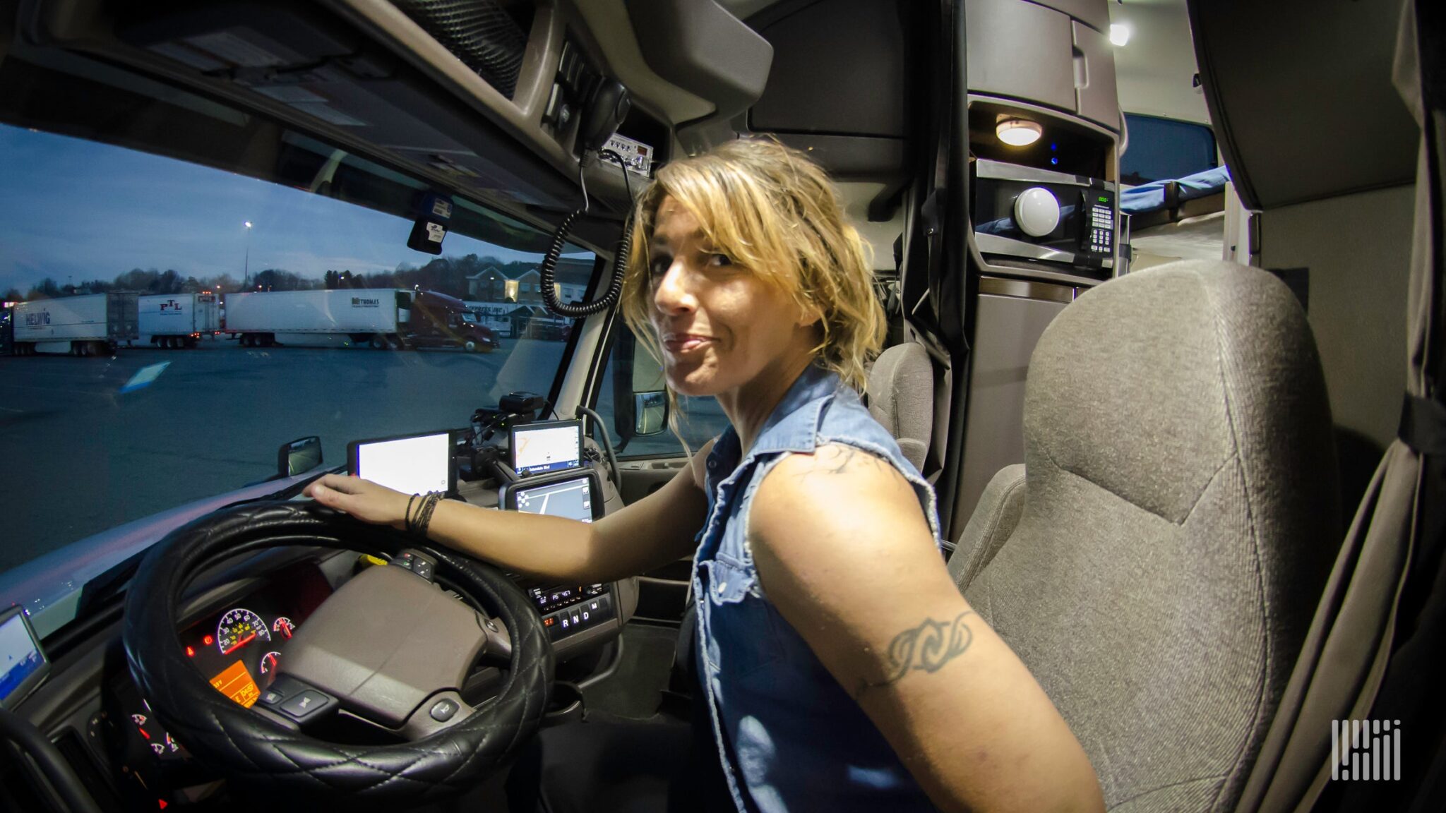 Блондинка сдает задом на грузовике с прицепом