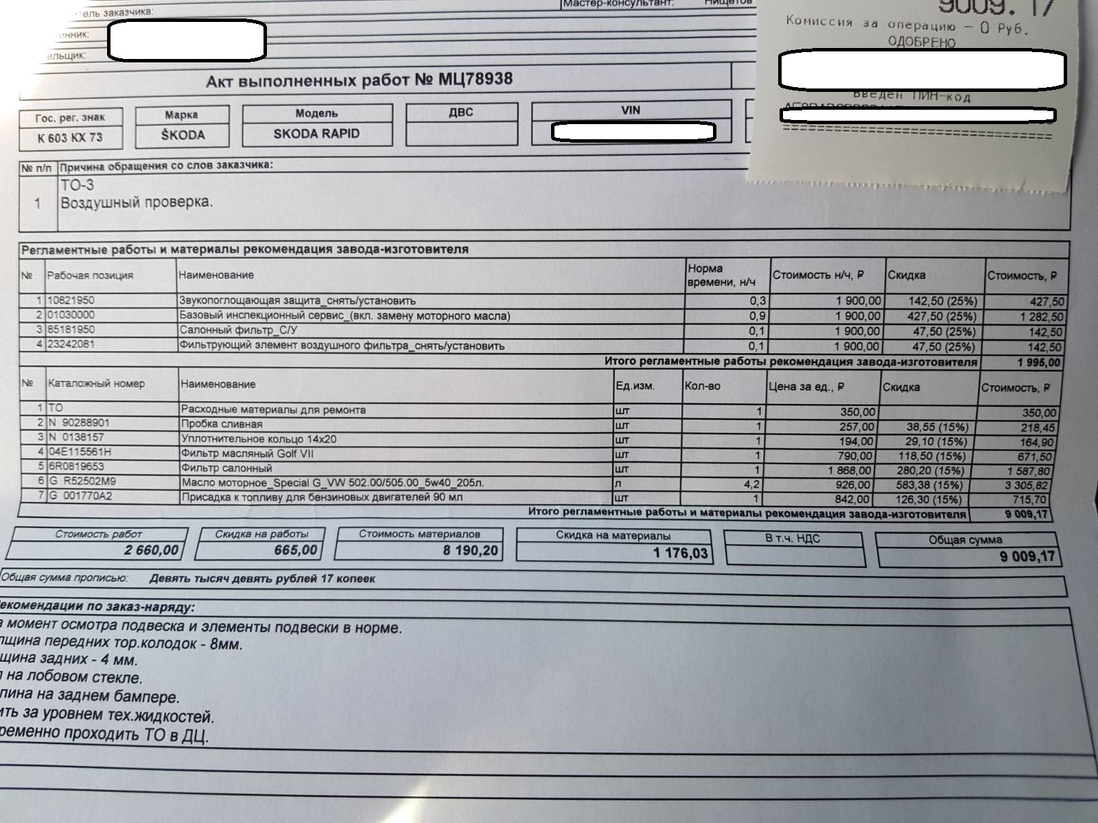 Расходники для ТО Skoda Rapid в 2022. Подстава от дилера.