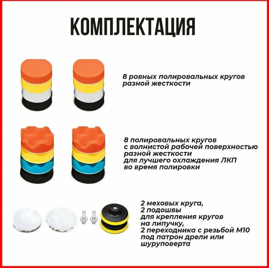 При выборе кругов учтите материал, из которого изготовлен автомобиль. Для разных типов поверхностей могут потребоваться разные типы кругов, например, восковые или пористые круги, чтобы достичь наилучшего результата.
